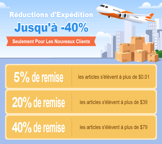 Votre première commande peut bénéficier d'une réduction allant jusqu'à 20% sur les frais d'expédition, qui sera automatiquement déduite lors du paiement.